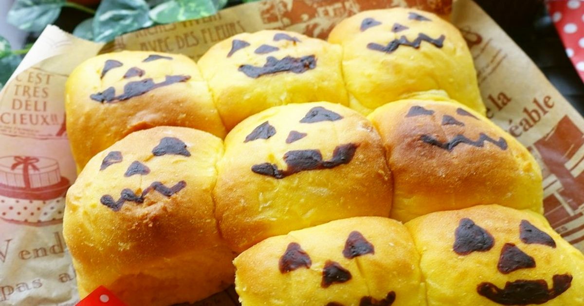 流行りのちぎりパンをハロウィンバージョンに。かぼちゃ味のパンに、ココアで顔を描いています。
