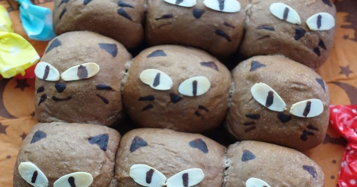 ハロウィンには黒猫も必須! ココア味のおいしくてかわいいパンです。猫の目はスライスアーモンドと、溶いたココアで作っています。