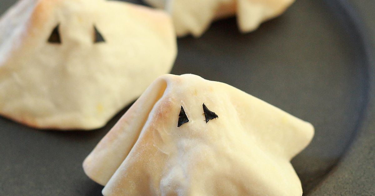 かぼちゃサラダを餃子の皮で包んでいます。中身を変えれば、見た目は同じで中身の違うおばけがたくさんになって面白いかも。